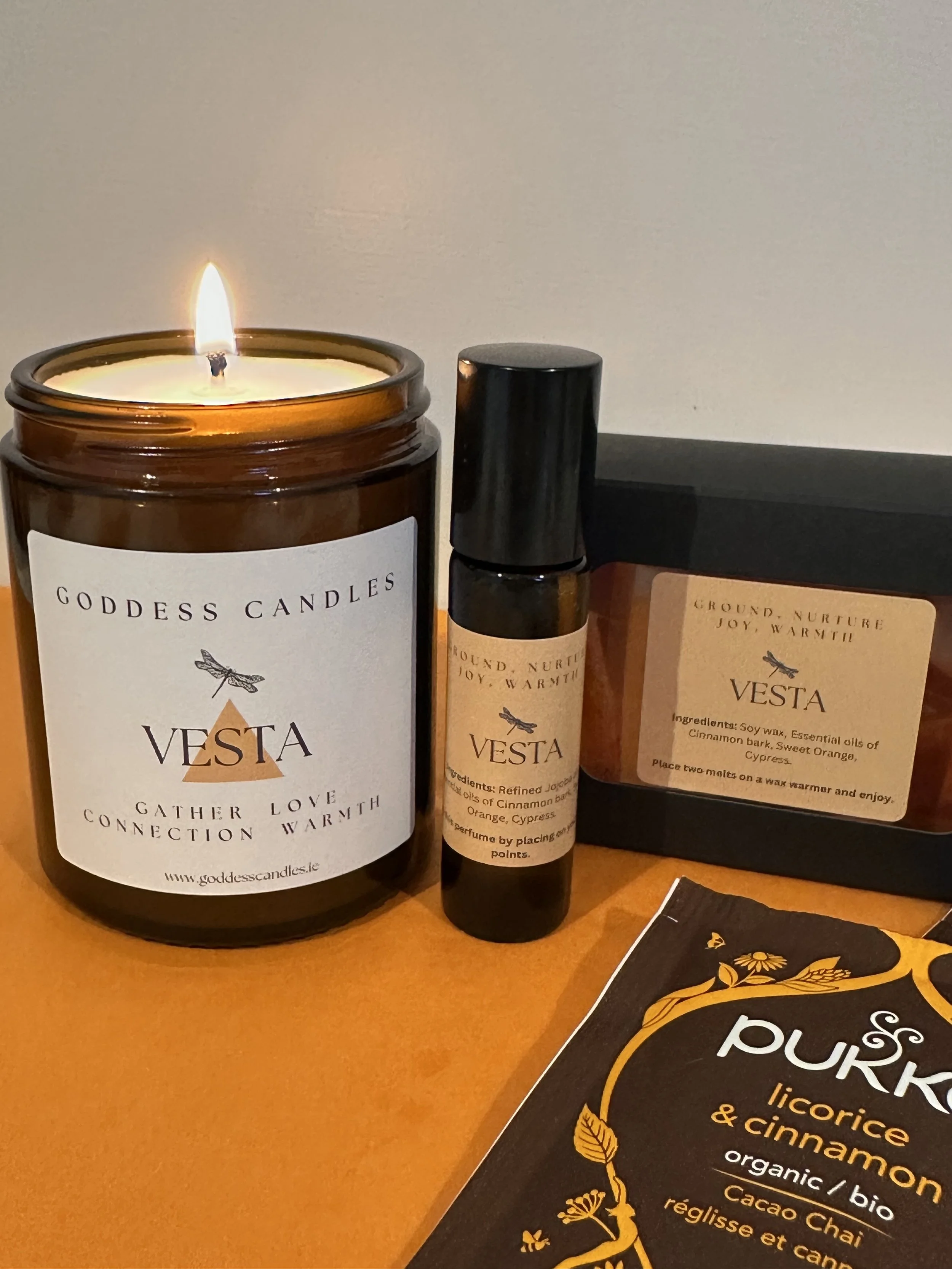 Vesta is the Goddess of hearth and home. She encourages us to get cozy, allow rest and to nurture our beautiful selves. Vesta reminds us to tend to our own inner flame. To be still and hear the whispers of our heart, to take moments away from the constant noise and distraction, so we can hear our own truth, authority and wisdom. Vesta reminds us if we build the fires of our hearts tenderly and with self compassion, we can go out into the world with a more open heart and a deeper understanding that we are all connected and on our own unique journey within this life. Vesta represents unity, belonging, connection and care. She also brings joy and celebration to gatherings with friends and family. She smells absolutely divine.